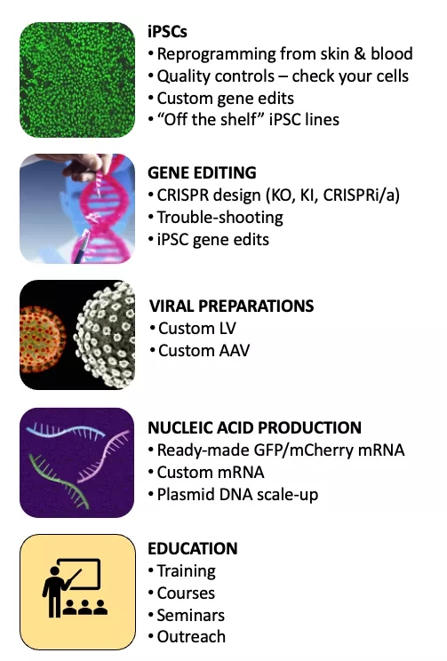 Today, the CAGT Core Facility, serves as an open-access infrastructure offering a range of services including AAV and LV vector production, mRNA production, iPSC-reprogramming, iPSC-edits, and CRISPR experimental designs.